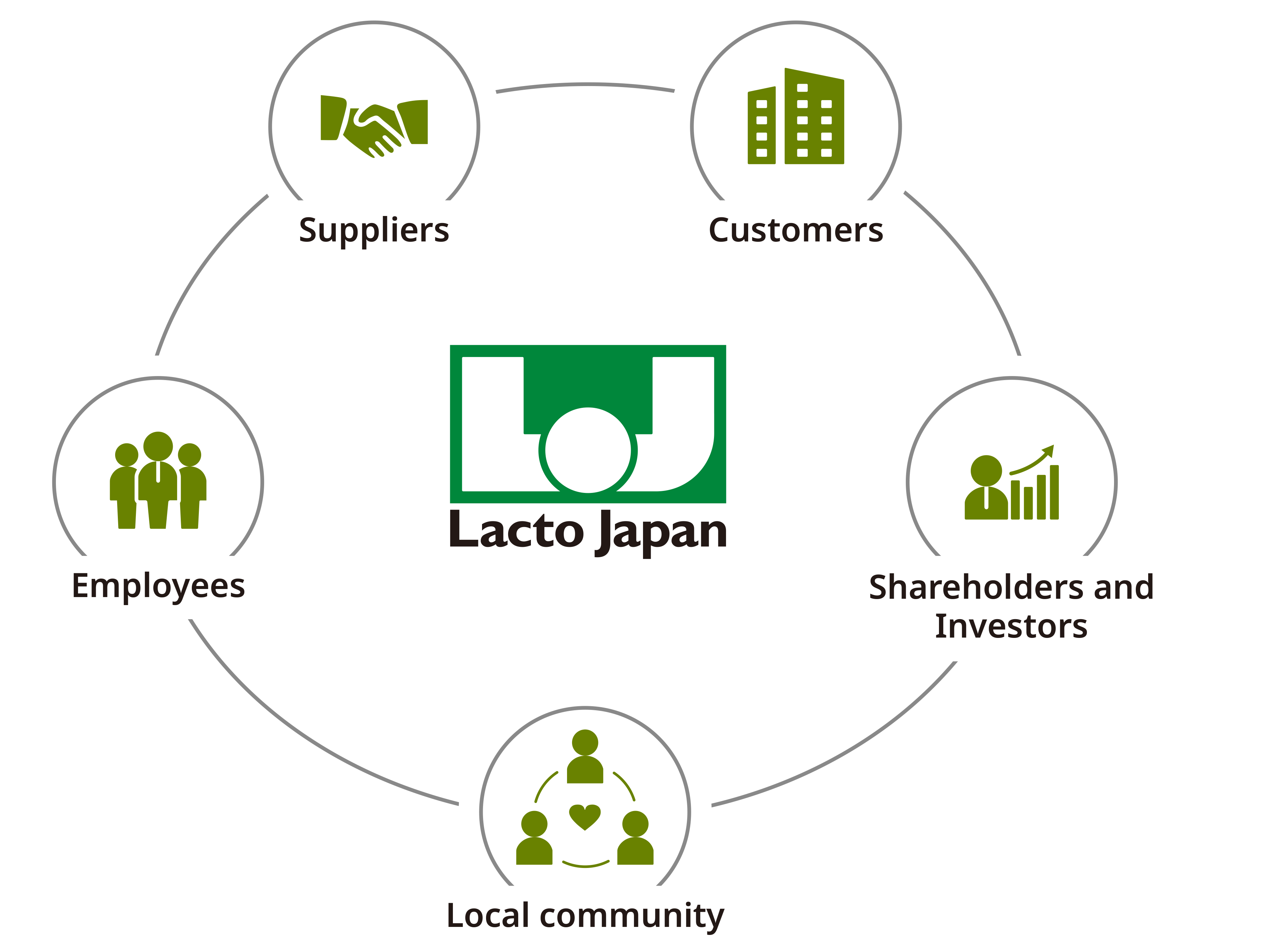 Lacto Japan Group places great importance on engaging in dialogue with its stakeholders, including shareholders and investors, employees, customers, suppliers, and local communities. We also exchange information and opinions with government bodies, such as the Ministry of Agriculture, Forestry and Fisheries.